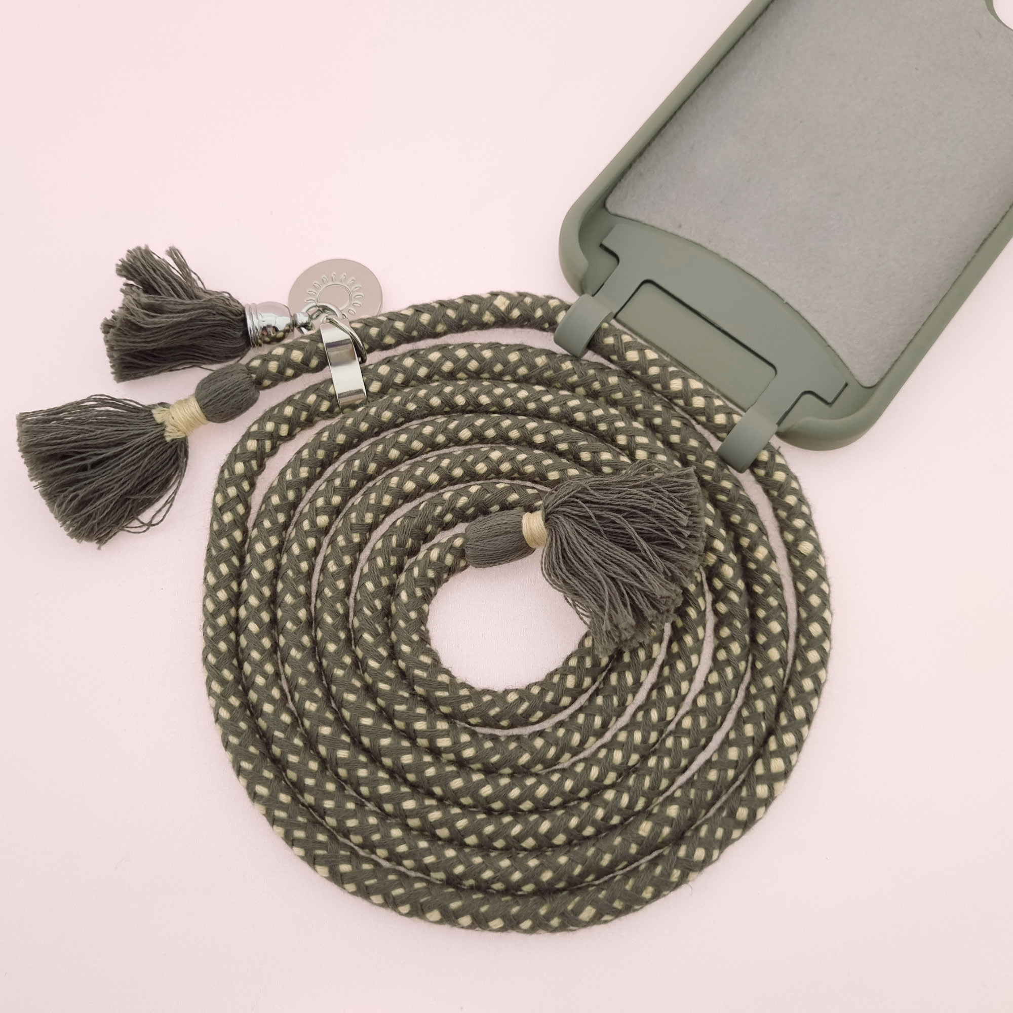 Damit ist auch die Frage „Handykette oder Handyhülle“ einfach beantwortet: Sie kann beides! Mit der abnehmbaren Kordel wird aus der Handykette schnell eine schützende Handyhülle – ganz ohne Ringe und ohne Ösen.
