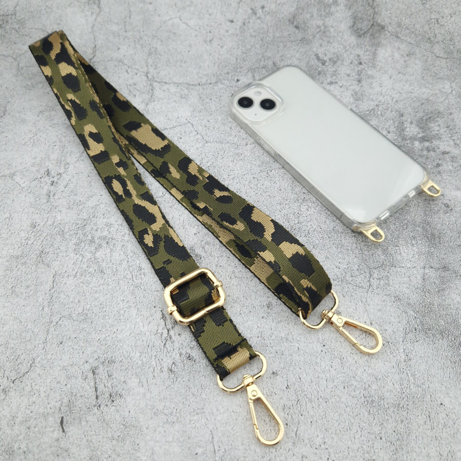 Short Facts Strap: abnehmbar | Gurtband im Leo Animal Muster | robuster Nylongurt | Breite ca. 2.5cm | Länge ca. 70cm – 130cm | individuell verstellbar | Karabiner und Metallelemente in Gold