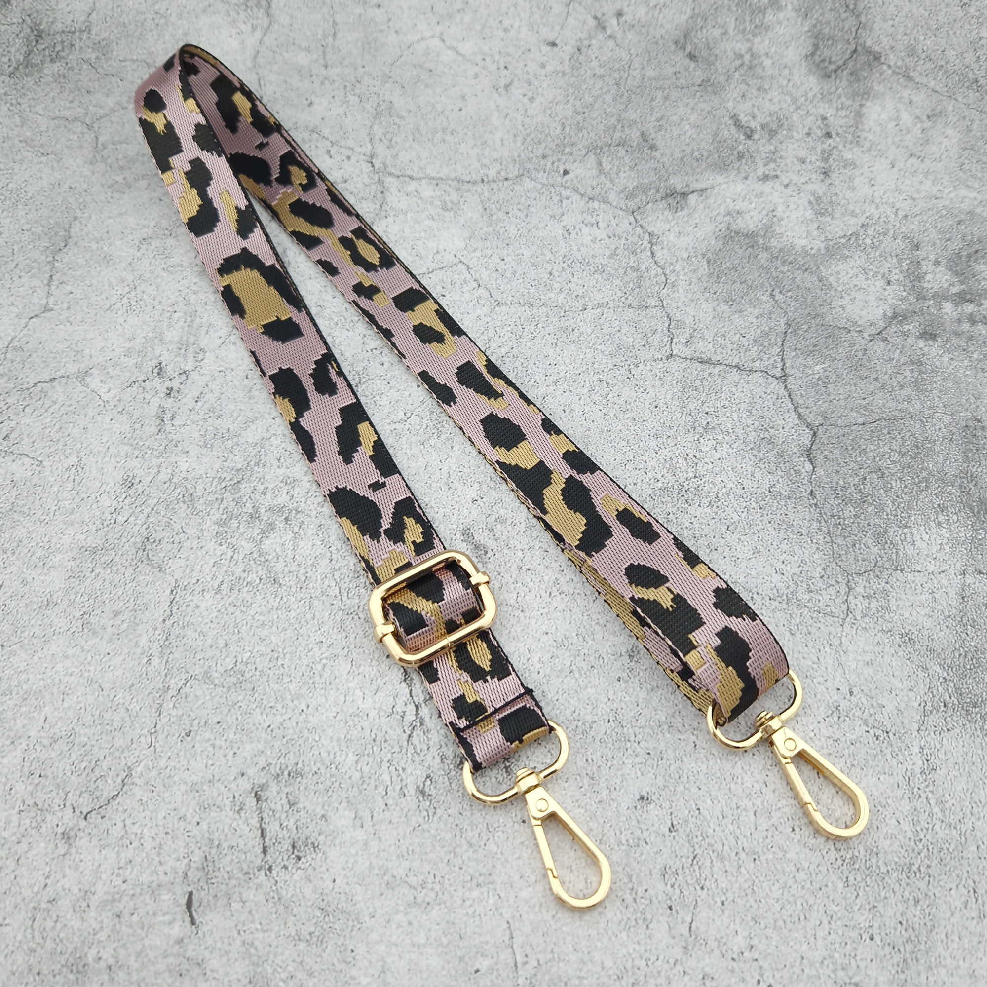 ★ Bandfarbe LEO ROSÉ: Gurtband im Leo Animal Print Muster in den Farben Schwarz, Beige und Rosé. Die Karabiner und Slider zur Längenregulierung sind Goldfarben.