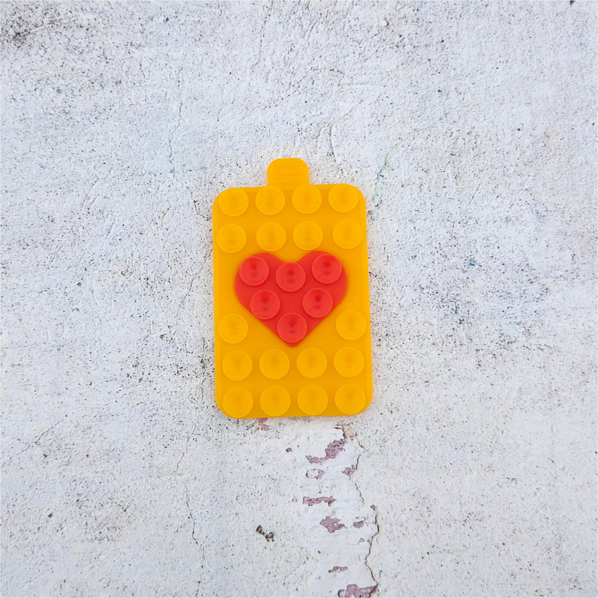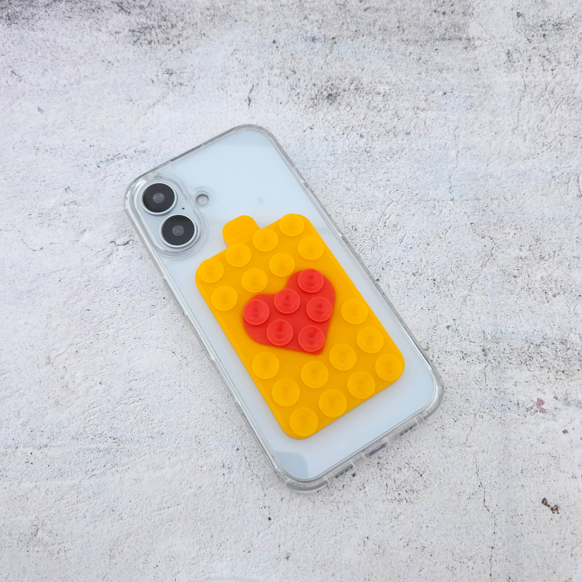 Orangefarbener Noppie-Heart-Patch mit rotem Herz auf transparenter Handyhülle, modernes Smartphone Accessoire mit Saugnäpfen auf beiden Seiten