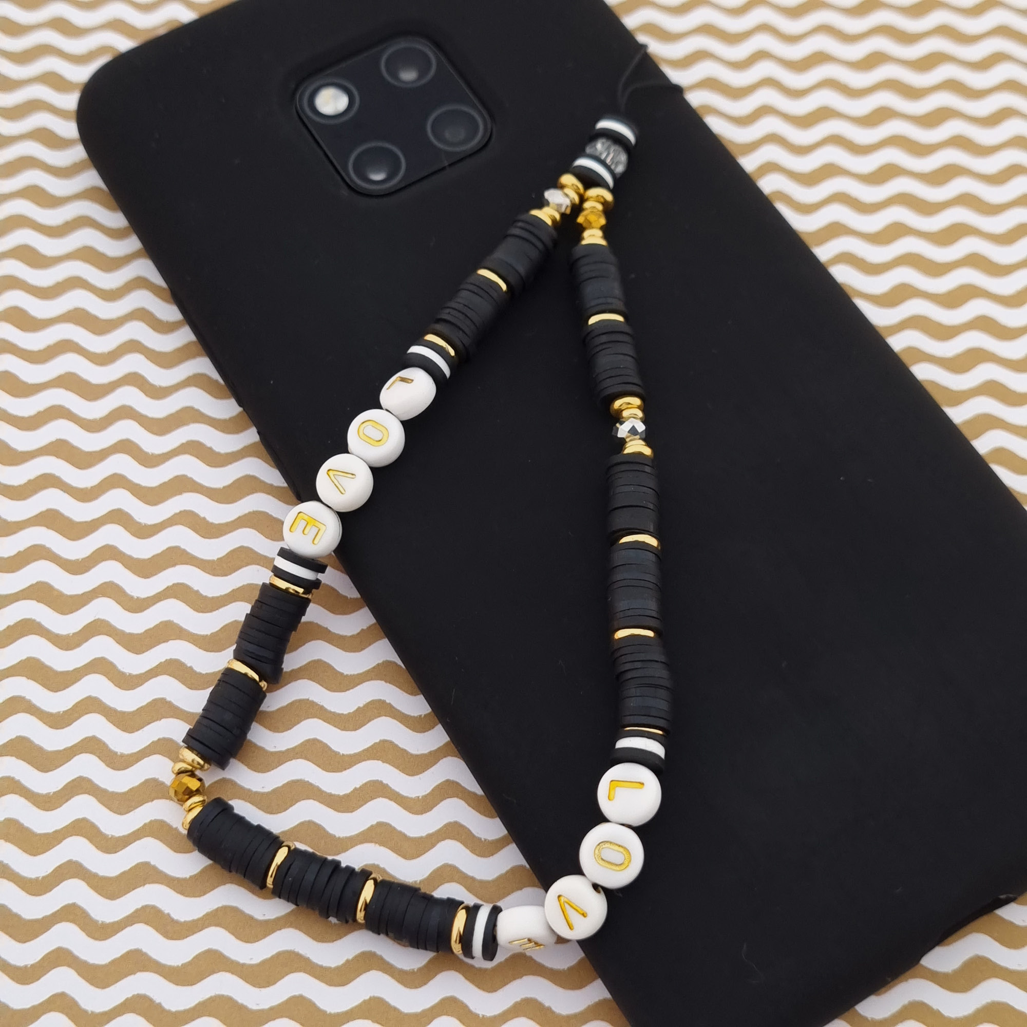 ★ Phone Charm NIGHT SKY mit Schriftzug LOVE: Katsuki Perlen in Schwarz und Weiß und glänzenden braunen und goldenen Perlen sowie Acrylperlen mit Schriftzug LOVE